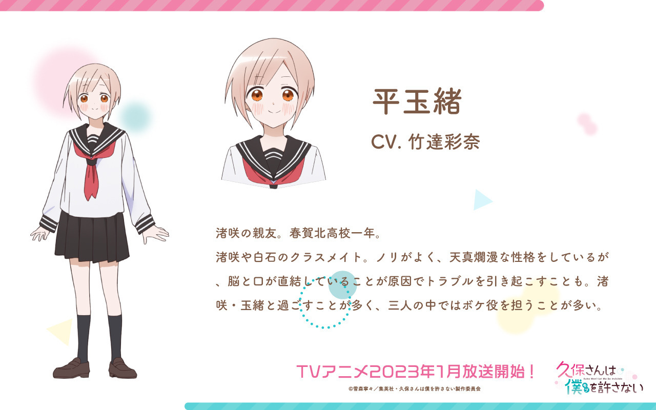 Одноклассница Дзюнты и хорошая подруга Нагисы и Хадзуки. Энергичная девушка, довольно проста в своих рассуждениях и часто оценивает всё поверхностно. Считает, что если увидит Сираиси, это принесёт удачу. Не сильна в учёбе, поэтому рада, что с каждым годом получает всё меньше двоек на экзаменах. Стыдится того, что её первая любовь — отец.