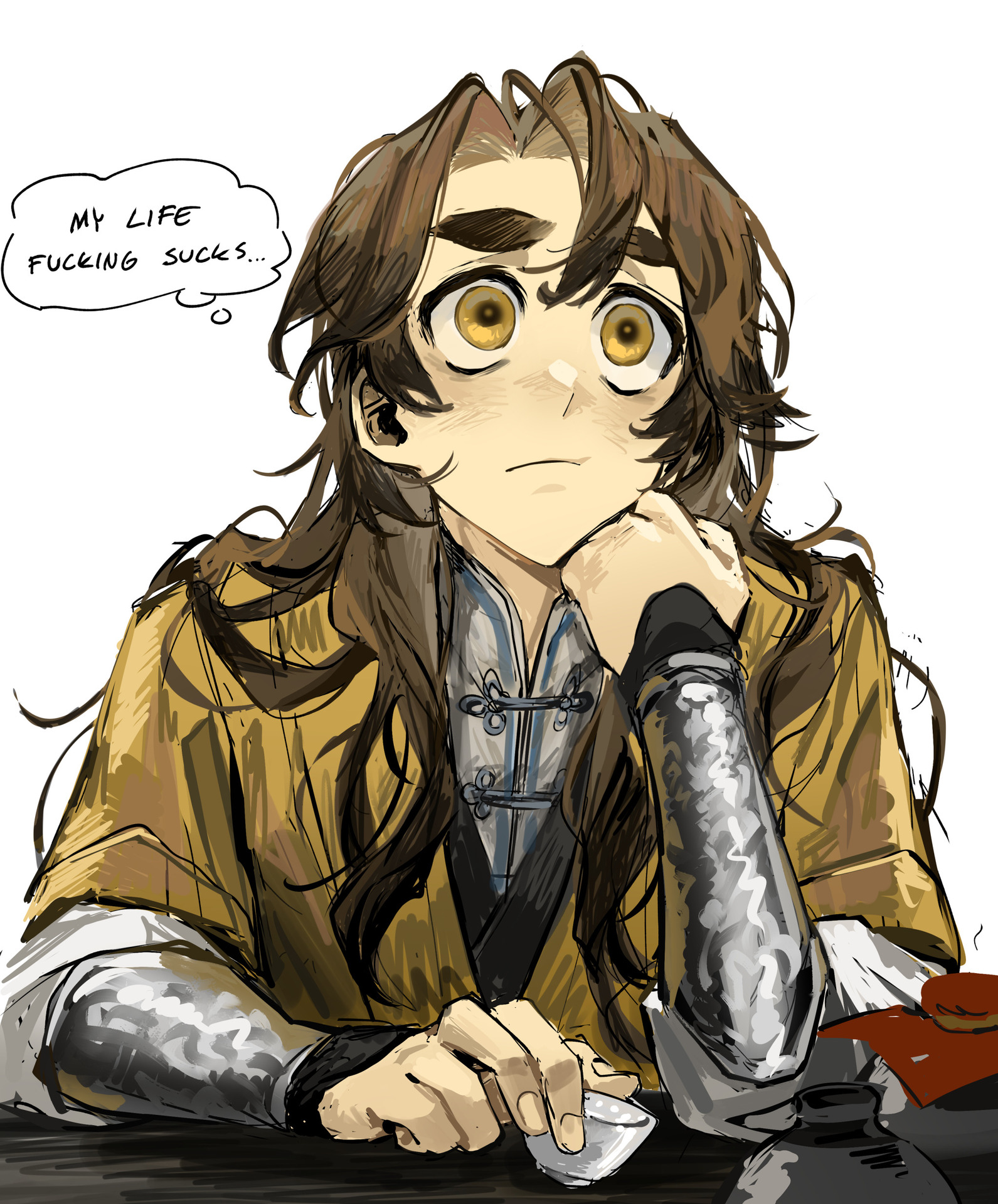Пусть Шан Цинхуа и труслив, можно заметить, что он забывает об инстинкте самосохранения в моменты, когда Мобэй-цзюню грозит опасность: так, он не раздумывая прыгает вслед за ним с хребта Майгу, так как демон не умеет летать, и даёт избить себя его дяде, Линьгуан-цзюню, чтобы протянуть время и не дать совершить последнему убийство собственного племянника.