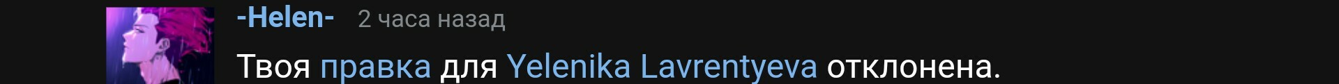 @-Helen-, Может быть объяснишь причину? Я тебе показал скриншот из фильма. Японцы написали Эленика Лаврентьева. Русские и японские персонажи называют её Эленика. Сложно два слово в ответ написать было?@pochemuchka228@Tedeika³, накручивает правки