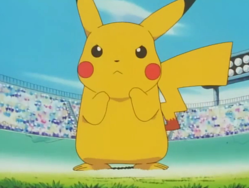 Покемон электрического типа. Покедекс утверждает, что Пикачу является покемоном-мышью. Пикачу был дан Эшу потому, что тот опоздал на выдачу своего первого покемона. Сначала Пикачу избегал Эша, периодически ударяя его током. Впрочем, их дружеские отношения начали налаживаться после того, как Эш спас своего питомца от диких Спироу. Пикачу не любит находиться внутри покебола, а предпочитает сидеть на плече Эша во время их путешествий.