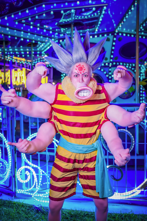Несколько наивен и глуповат, хотя и добр. Сначала работал на Арлонга, после разгрома последнего вернулся на Грайнд Лайн - работать поваром и владельцем плавучей закусочной, неподалеку от архипелага Сабаоди. Его помошница Кейми - неудачливая русалка, которую он вечно спасает из пасти Морских Монстров и из лап пиратов и работорговцев. Владеет Шестимечевым стилем (как раз по количеству рук). Как и все рыболюди гораздо сильнее человека, а его мечи весят по 300 килограмм. Тем не менее, проиграл тяжело раненному Михоуком Зоро. Когда встретил Мугивар второй раз, то, чтобы загладить вину перед Нами за то, что участвовал в грабеже её деревни, решил помочь им добраться до острова рыболюдей и найти смоляного мастера.