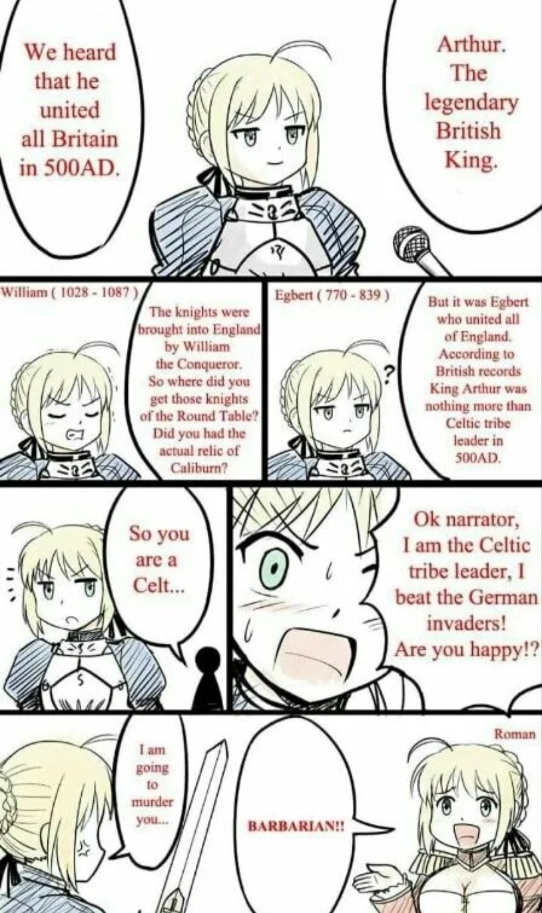Настоящее имя Сэйбер — Артория Пендрагон, однако в рамках мировой истории она известна как легендарный Король Артур (её настоящий пол был скрыт от окружающих, дабы она взошла на престол). Артория убеждена, что её правление было ошибкой, ввергнувшей королевство в хаос. Поэтому желание Сэйбер в этой войне — переписать историю и отказаться от трона в пользу человека, не столь безэмоционального и хладнокровного, как она сама. Оружие Артории — легендарный Экскалибур (который скрыт потоками ветра, дабы не раскрывать личности своего владельца), чьи ножны, Авалон, были давно потеряны.