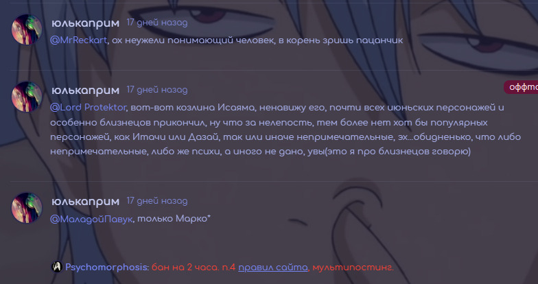 @siverko19, написала* я не писала подряд их, не надо тут меня поучать!мне постоянно баны кидает этот админ и по ясной причине, ненависть ко мне, зашла и пишу, потому что хочу справедливости, бесит это издевательское отношение ко мне, надеюсь, что я все ясно разъяснила.@siverko19@Зулу24, то есть, три подряд выглядят не так?или слово "подряд" для тебя ещё слишком сложное?