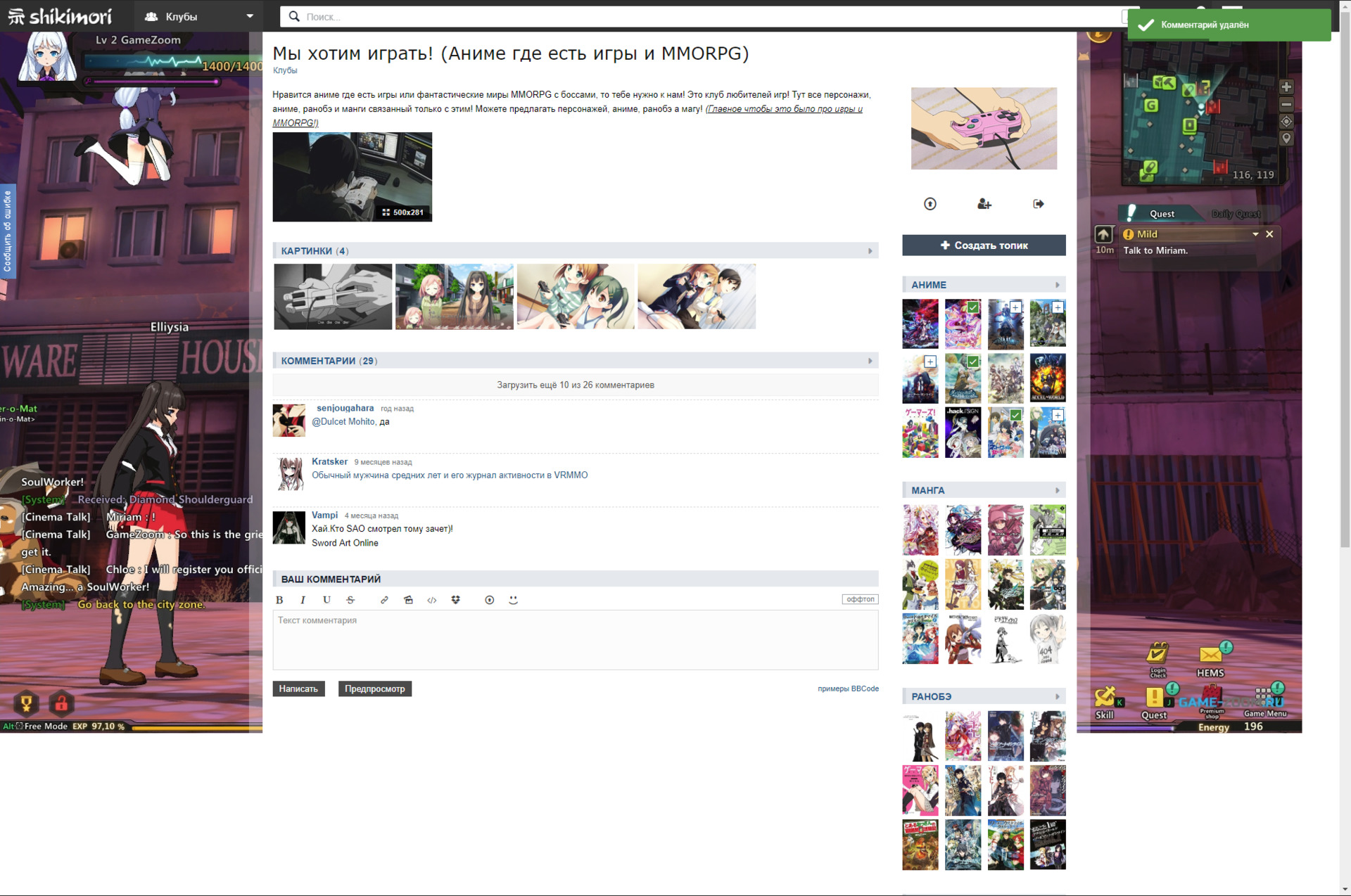 @ukla, Тема должна быть про игру. А тут просто фэнтезийный мир.@ukla@Emily Ritter, Ты прикалываешься что ли? ragnarok online это мморпг! Причем в свое время очень популярная. Аниме вышло спустя 2 года после выхода игры. Анимка как раз про игру, только без явных уровней и прочего. Но кто играл в игру все поймут. И повышение проф и прочее. Я бы сказал, что аниме это взгляд на игру глазами персонажа игрового.@~Amy~@ukla, Ну если есть такая игра, тогда ладно.@_senjougahara@Dulcet Mohito, даSword Art Online