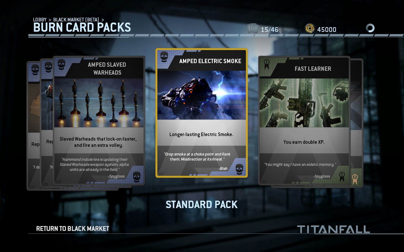 И еще кое-что С введением внутриигровой валюты некоторые могут обеспокоиться, что следующим нашим шагом будет позволить игрокам тратить реальные деньги на получение преимуществ в игре. Черный рынок никак не связан с микротранзакциями — кредиты можно получить только играя в Titanfall!