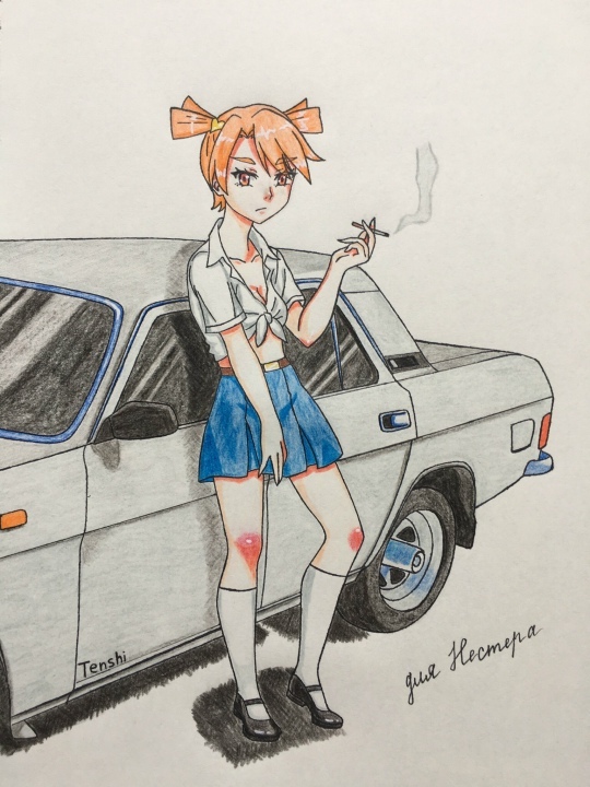 @Нянпасу@CocoNuts, коленки красные, наверное на роликах катается и часто падает.А сам рисунок прикольный.