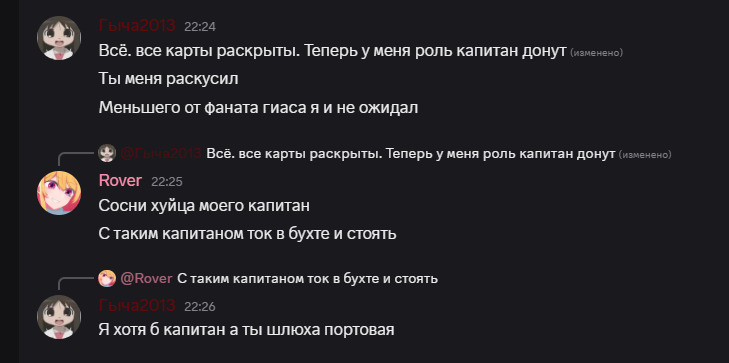 Все цитаты взяты с запрещенного на территории шикимори дискорд сервера Б****