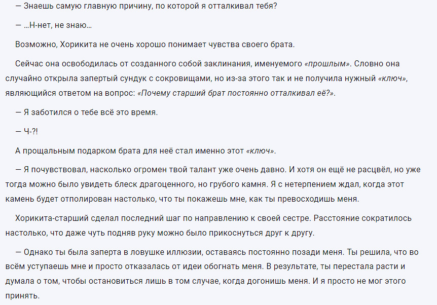 @ggalwaybboy, добавлена@POPluser, у Манабу нет никакого чувства вражды к своей младшей сестре, его мотивы полностью раскрываются в последнем томе первого сезона ранобэ@POPluser@Ragnac, тут у половины персонажей такая ситуация. Но в открытую он показывает вражду к сестре большую часть ранобэ. А концовка последней главы не перебивает это всё. Разве ты хочешь сказать, что Итачи Учиха тоже пытался убить брата?@Ragnac@POPluser, однако персонажей всё равно прописывает автор. И если он считает, что все действия были направлены на развитие Сузунэ, то так оно и есть.К тому же, открытая вражда - это прямое противодействие и, если я правильно помню, Манабэ никаких действий против своей сестры никогда не предпринимал (За весь первый год только один спарринг с обоюдного согласия).