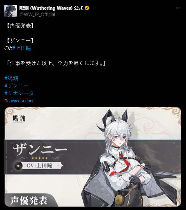 Об игреWuthering Waves — это кроссплатформенная игра в жанре экшен RPG с открытым миром, разработанная китайской компанией KURO GAME (известна по «Punishing: Gray Raven»). Глобальный релиз игры состоялся 23 мая в 5:00 по МСК.Информация по игре: wutheringwaves.gg/starter-guide/youtubeyoutubeyoutubeИсточникиОфициальный сайт: mc.kurogame.com | wutheringwaves.kurogame.com/en/Страница на Bilibili: space.bilibili.com/1955897084/dynamicHoYoLab от KuroGames: www.kurobbs.com/person-center?id=10012001Японский YouTube: www.youtube.com/@wutheringwaves3352Список источниковЕсли не указано иное, то источником является официальный сайт:ZH mc.kurogames.com/main#resonatorsJA wutheringwaves.kurogames.com/jp/main/#resonatorsEN wutheringwaves.kurogames.com/en/main/#resonatorsKO wutheringwaves.kurogames.com/kr/main/#resonatorsSanhua: www.bilibili.com/video/BV1Eh4y1D7JmAalto + Leader of the Exiles: www.bilibili.com/video/BV1SN411H7wpYangyang:JA x.com/WW_JP_Official/status/1705165891296727519EN x.com/Wuthering_Waves/status/1705160015043272924KO x.com/WW_KR_Official/status/1706971947572003206Danjin + Narration: www.bilibili.com/video/BV1gu4y1b7jzJianxin + Researcher + Narration: www.bilibili.com/video/BV1dJ4m147yjBaizhi:JA youtu.be/4oUt_Rz4E1wEN x.com/Wuthering_Waves/status/1790658204013297675 (upd. 05-15)KO x.com/WW_KR_Official/status/1781261469667197156Encore: www.bilibili.com/video/BV14Z421n7dXChixia:JA youtu.be/L4OATQAuc_oEN youtu.be/0WPl2jDzZzU (upd. 05-10)KO x.com/WW_KR_Official/status/1783813279225094336Taoqi:JA youtu.be/POuVjGLnFd0EN youtu.be/6VEUnUcoqww (upd. 05-07)KO x.com/WW_KR_Official/status/1785255274259136776Jiyan:JA x.com/Wuthering_Waves/status/1791770706642166157 (upd. 05-18)EN youtu.be/aleLMD5HyCMKO www.bilibili.com/video/BV1Qm421M7SM/ (upd. 05-22)Lingyang + Master + Children 1–3 + Teammate 1–3: www.bilibili.com/video/BV1jm421W7RLCalcharo:JA x.com/WW_JP_Official/status/1792495484441108843 (upd. 05-20) (twitter.com)EN Информация из игры (upd. 05-23)KO x.com/WW_KR_Official/status/1789233994103660827Yuanwu:JA youtu.be/0lxRMGS0OmAEN Информация из игры (upd. 05-23)KO x.com/WW_KR_Official/status/1789958770740670831Jinhsi:ZH www.bilibili.com/video/BV1Qr42157ut?t=1035.1 (17:16) (upd. 05-19)JA x.com/WW_JP_Official/status/1791408326351196509EN www.bilibili.com/video/BV1ji421e7nM/ (upd. 06-20)KO x.com/WW_KR_Official/status/1791393228500922847Verina:JA youtu.be/0PpVm9j25uU (twitter.com)EN Информация из игры (upd. 05-23)KO Kang Sae Bom — Информация из игры (upd. 05-23)Rover:JA Мужской / Женский (upd. 05-23)EN youtu.be/scTGyptoxbkKO Мужской / ЖенскийYinlin:JA www.bilibili.com/video/BV1hy411h7wd/ (upd. 06-06)EN youtu.be/scTGyptoxbkKO www.bilibili.com/video/BV1hy411h7wd/ (upd. 06-06)Geshu Lin (NPC): www.bilibili.com/video/BV1Qm421M7SM/Mortefi:JA Информация из игры (upd. 05-23)EN Информация из игры (upd. 05-23)KO Kim Da Ol — Информация из игры (upd. 05-23)Scar:EN x.com/ShaiMatheson(Other) Manager + Boss: www.bilibili.com/video/BV1hy411h7wd/Changli + Jue (NPC): www.bilibili.com/video/BV1ji421e7nM/Zhenzhi + Client (NPC): www.bilibili.com/video/av1456460272/Xiangli Yao + в детстве + отец: www.bilibili.com/video/BV1UMHsecEAJ/Camellya:JA x.com/WW_JP_Official/status/1835876336579043766Прочие: www.bilibili.com/video/BV1VuDZYDE9L/ (upd. 11-09)Lumi:JA x.com/WW_JP_Official/status/1835877587098181995The Shorekeeper: www.bilibili.com/video/av113204483133775/Youhu: Информация из игрыCarlotta:ZH www.bilibili.com/video/BV1Qs6aY7E38/ (upd. 12-30)JA x.com/WW_JP_Official/status/1860521219927294220EN www.bilibili.com/video/BV1Qs6aY7E38/ (upd. 12-30)KO www.bilibili.com/video/BV1Qs6aY7E38/ (upd. 12-30)Roccia:JA x.com/WW_JP_Official/status/1860883608145404274Прочие: Информация из игры (upd. 2025/01/02)(Other) Cristoforo + Man from Fisalia Family + Woman from Fisalia Family + Man from Montelli Family + Head of Finlake + Imperator: www.bilibili.com/video/BV1uMk1YWEAdBrant:JA x.com/WW_JP_Official/status/1870650464624373914Phoebe:JA x.com/WW_JP_Official/status/1870680665554911286Zani:ZH www.bilibili.com/video/av114404188360721 (upd. 04-27)JA x.com/WW_JP_Official/status/1870710862241239302EN www.bilibili.com/video/av114404188360721 (upd. 04-27)KO www.bilibili.com/video/av114404188360721 (upd. 04-27)(Other) Giacomo Fasciaspina + Auctioneer: www.bilibili.com/video/BV1Qs6aY7E38/Abby:JA youtu.beCantarella:ZH www.bilibili.com/video/BV1uPX8YMEWD/ (upd. 03-24)JA x.com/WW_JP_Official/status/1892831623655411837EN www.bilibili.com/video/BV1uPX8YMEWD/ (upd. 03-24)KO www.bilibili.com/video/BV1uPX8YMEWD/ (upd. 03-24)Cartethyia:ZH www.bilibili.com/video/BV1XJjZzkEfm/ (upd. 05-28)JA x.com/WW_JP_Official/status/1905152808913080660EN www.bilibili.com/video/BV1XJjZzkEfm/ (upd. 05-28)KO www.bilibili.com/video/BV1XJjZzkEfm/ (upd. 05-28)Ciaccona:ZH www.bilibili.com/video/BV1sKJNzpEXs/ (upd. 05-18)JA x.com/WW_JP_Official/status/1905154067556417768EN www.bilibili.com/video/BV1sKJNzpEXs/ (upd. 05-18)KO www.bilibili.com/video/BV1sKJNzpEXs/ (upd. 05-18)LupaZH www.bilibili.com/video/BV1SKKBzsEiQ/ (upd. 25-06-28)JA x.com/WW_JP_Official/status/1928647630323855683EN www.bilibili.com/video/BV1SKKBzsEiQ/ (upd. 25-06-28)KO www.bilibili.com/video/BV1SKKBzsEiQ/ (upd. 25-06-28)PhrolovaZH www.bilibili.com/video/BV1uuufz9ELi/ (upd. 25-07-20)JA x.com/WW_JP_Official/status/1933399814559109177EN www.bilibili.com/video/BV1uuufz9ELi/ (upd. 25-07-20)KO www.bilibili.com/video/BV1uuufz9ELi/ (upd. 25-07-20)IunoJA x.com/WW_JP_Official/status/1933401467337257241AugustaJA x.com/WW_JP_Official/status/1933402738492387500NPC Fen