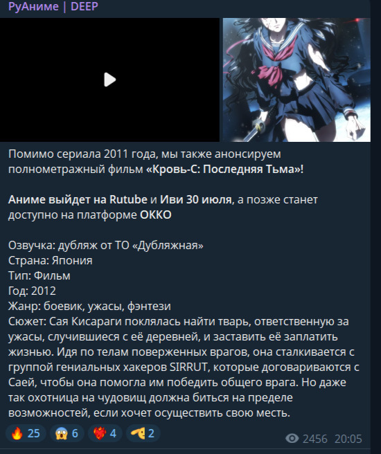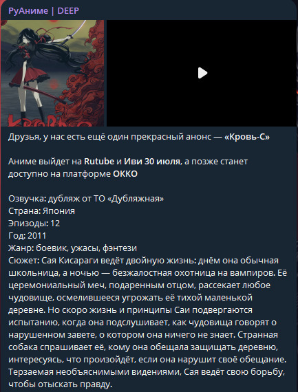 @Zr1me@ReTr0dext, добавили и еще некоторые другие релизы@Zr1me@kolt, неопределенно долго@kolt@Zr1me, ну чтож, наверное, это хорошие новости@Bloodbear@Kliper, скорее всего разные плееры@Дмитрий Державин, Blood-C: The Last DarkКровь-C: Последняя тьмаКровь-C: Последняя тьма