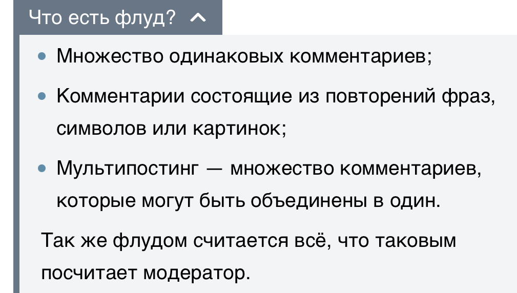 с первыми тремя пунктами понятно, а модер стопудова уже активность мою замониторил, раз выдан «оффтоп», за флуд же ничего не выписал. как предъявят, так и подумаю. пока в правилах ничего внятного не увижу, буду пользоваться неопределенностью и делать что хочу