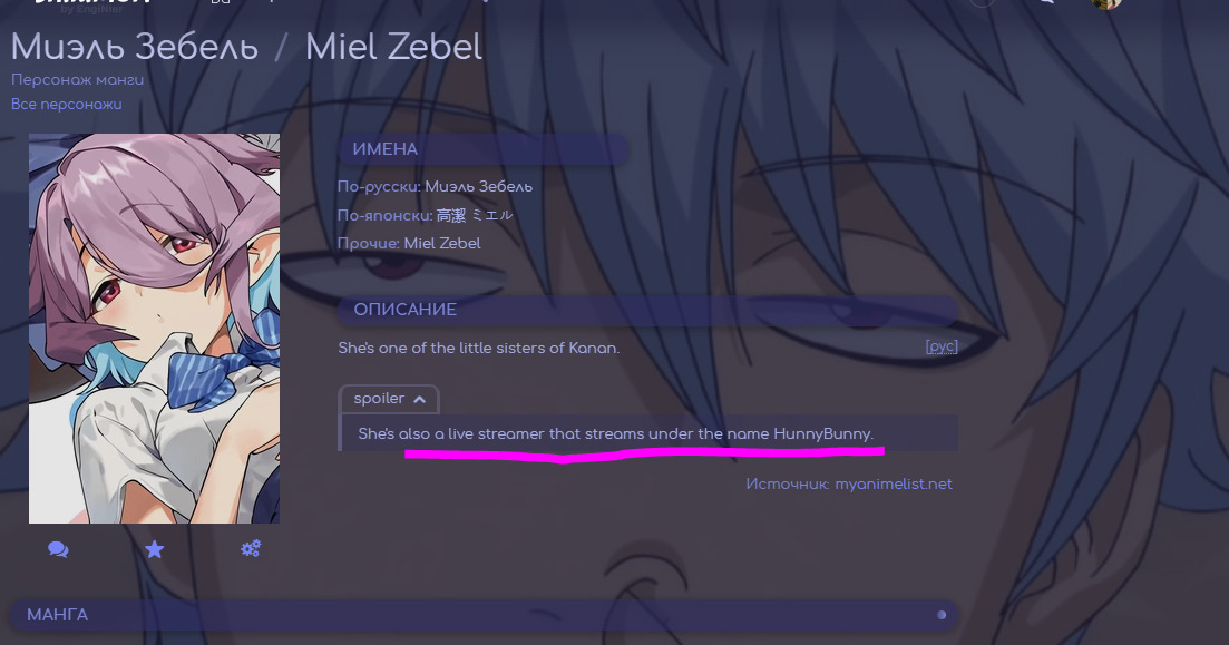 @🌌슬픈 비서🌙, Jugyeong LimДжугён Лим — известный блогер и инфлюенсер на YouTube, специализирующийся на макияже@🌌슬픈 비서🌙@🌌슬픈 비서🌙@🌌슬픈 비서🌙, BlackБлэк — демонический создатель контента, интересующийся видео на YouTube@🌌슬픈 비서🌙@🌌슬픈 비서🌙, аниме анонсировали. но пока из манги Miel ZebelМиэль Зебель англ. описание@🌌슬픈 비서🌙@🌌슬픈 비서🌙, Kurumi SakaguchiКуруми Сакагути - витубер@🌌슬픈 비서🌙@Apc, спасибо).@flyoffly, спасибо).@Borzaya, спасибо).@Лесная Фиалка, спасибо).@Borzaya, тут не совсем вас поняла. Так он ведет видео блог? Или он просто создает контент для других блогеров?@siverko19, там его нет. Почитала и описание манги, но там тоже нет подобной информации.@ityprineympl, спасибо).@siverko19,@Borzaya@🌌슬픈 비서🌙, а вот жешь@🌌슬픈 비서🌙@siverko19, а, ой... Неловко получилось, прости. Я и не подумала о том, что можно на англ описание переключить.Спасибо).