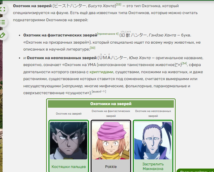 @siverko19,@Peree@Clear Foe, ты про гурманов забыла. они то охотятся как норм охотники. вот их сюда точно надо. а группа Кайта скорее исследователи, да@Peree@Clear Foe, в хантере всё-таки именно охотники на зверей, а не монстры. Они разделяются на подгруппы, так что не согласен тут. По твоим примерам не знаю. Ты говоришь о монстрах и что они похоже на животных. А я про то, что в аниме звучит - хантеры на животных и что они исследуют мир ради ловли на них.@siverko19, гурманы же - это к еде.@siverko19@Peree, что? ты о чём? а обычные охотники не за едой охотятся?@Peree@siverko19, в хантере? нет@siverko19@Peree, в хантере да... пересмотри, если не помнишьMenchiМэнчи