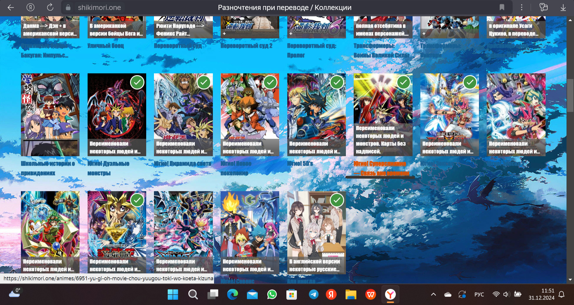 @Alnex-san@Alnex-san@Teosofff, Воля ваша, вы - соавтор@Zxcwmd,@Alnex-san, Югио! Дуэльные монстры, Югио! Новое поколение, Югио! 5D, Югио! Зексал, Югио! Зексал 2, Югио! Арк-Файв, Югио! Тёмная сторона измерений, Югио! Врейнс, и Югио! Севенс. (переименовали некоторых людей и монстров. Карты без надписей -@Alnex-san,@Andryukhendiy@nika1500000000, соавторство ваше. Можете спокойно вносить изменение в данную коллекцию@nika1500000000@Alnex-san, Ещё Алю добавил, вспомнил одно различие@Alnex-san@nika1500000000,@Alik Korolevsky, на самом деле японское название - намеренно двусмысленное, или скорее даже многосмысленное. Как перевести так чтобы это не потерять - предлагайте варианты, я вот не знаю)@nika1500000000, Вы забыли написать под ГХ´ом то, что 4Кидс не Дублировали бедную арку Даркнеса (он же четвертый сезон). Ну, и 4Кидс ещё озвучивали Бондс Бьонд Тайм@nika1500000000@Henasmilus, по сути до третьего сезона, когда сказали как называется титан Эрена, у всех могли быть разночтения, лол. Поэтому все перевели так как им захотелось@Andryukhendiy, исправился@Andryukhendiy@Alnex-san,@Zaha Sanko@Роман Голубянков,@Роман Голубянков,Грей Фуллбастер - Грей Отмороженный