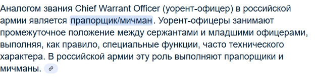 @Palehermit@Redington, Не заметил, добавил.@Ndas, Я бы хотел коллекцию исключительно с российскими званиями, так как не все пользователи ознакомлены с НАТО и их званиями. Поэтому как я понял Старший уорент-офицер = Прапорщик.Понял, тогда убери данную категорию.