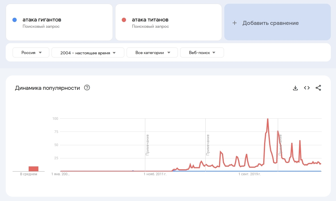@StoryTeller,@KazumaSatou@StoryTeller, Да и ещё... есть названия, которые одновременно являются именами персонажей... так и кого искали, вбивая "Наруто"? Может тогда добавить и Тандзиро, и Эрен?@KazumaSatou@Никитос231, Фраза "ван пис" пятая по частоте обращённых запросов в гугле из фраз являющихся названием аниме.@Никитос231@StoryTeller, спасибоНасчёт "Атаки гигантов"... Такие вариации я проверял и количество запросов по ним - мизерно, почти что 0