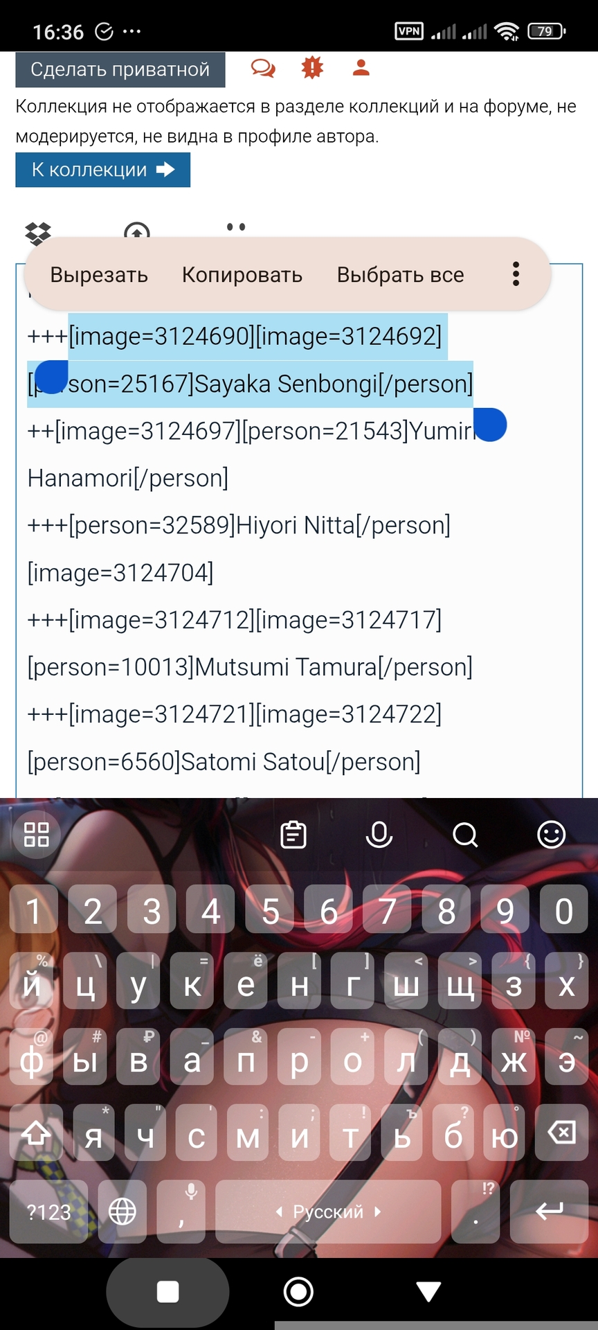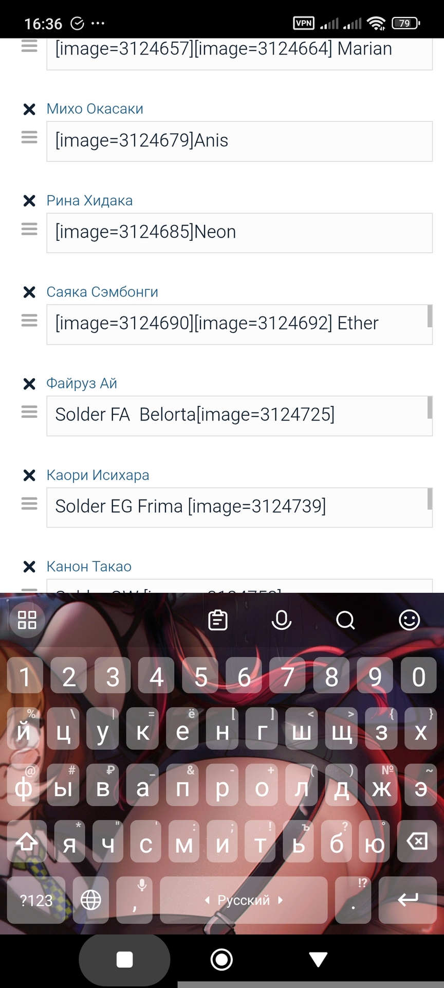 @ShelterK@Nafiron, не знаю как это сделать, но спасибо@Kolishzaka,@Redington,@Raiden Vi,@Raiden Vi@ShelterK, у тебя два варианта, либо вставлять картинки в комментарии/шапку чтобы получить [id=?????] и затем копировать и вставлять его в комментарии под сэйю, либо использовать [ img]*ссылка на картинку*[/img] (без пробела) так же в комментариях под сэйюВторой вариант подходит лучше для изображений с прозрачным фоном