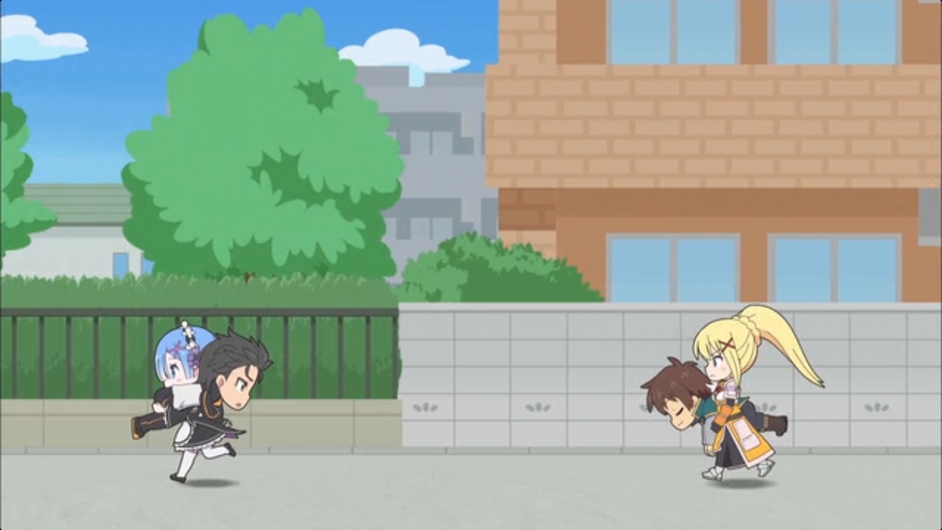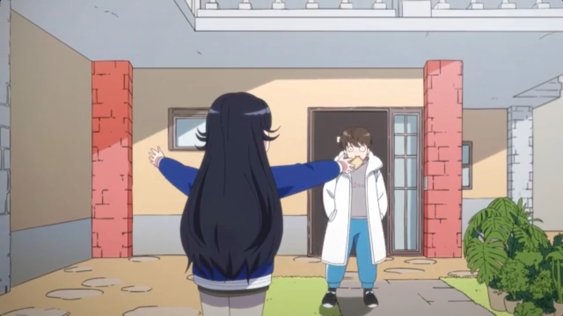 (Второй скрин - вдалеке в середине кадра, возле учителя в красном спортивном костюме, бежит в школу с хлебом во рту)