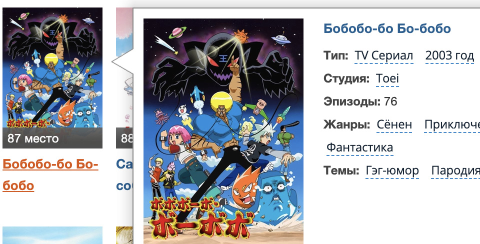 @Vasil_isk@dhustuijcetyuyfdiovdse, а я 6, включая Тома и Джерри.@Vasil_isk@dhustuijcetyuyfdiovdse, согласен, здесь явно не хватает Кайт — девочка-убийца. Но даже она не выдержала столь жёсткой конкуренции.@dhustuijcetyuyfdiovdse@Vasil_isk, неужели это популярнее чем Легенда о Героях Галактики?@Vasil_isk@dhustuijcetyuyfdiovdse, ну, этот сериал, кстати, как раз по TV Asahi транслировался. Плюс, хотя я не находил такой информации, вероятно, голосовать можно было только за ТВ-сериалы, а Легенда это OVA, по той же причине, наверное, здесь нет ни одного фильма того же Хаяо Миядзаки. А сериал этот, вроде, ничего такой.Ну и есть некоторые мои любимые, что здорово