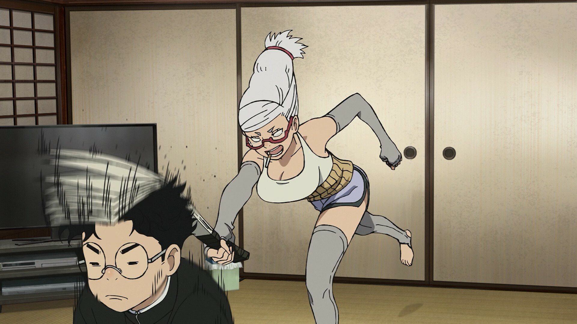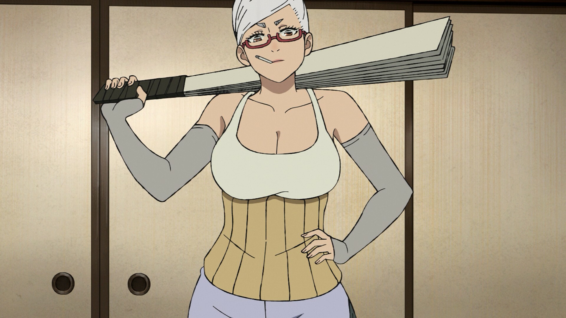 @Ловец cтрекоз,Hanae IchinoseХанаэ Итиносэ когда навеселе - любит войти в образ и исполнять танец с обычными бумажными веерами. Видно в минизаставке в середине серии. Слава богу никого не лупит ими, хотя по характеру легко могла бы
