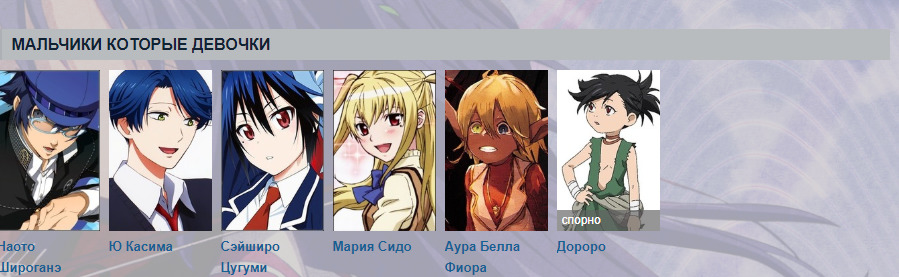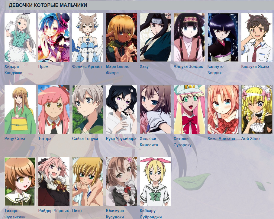 Якутеринбург0 / 0✓✕311422 сентября 201916 октября 2025Я постараюсь собрать по больше трапов, буду рада за помощьДевочки которые мальчикиHideri KanzakiХидэри КандзакиPlumПрэмFelix ArgyleФеликс АргайлMare Bello FioreМаре Белло ФиореHakuХакуAlluka ZoldyckАллука ЗолдикKalluto ZoldyckКаллуто ЗолдикKazuki YasakaКадзуки ЯсакаRitsu SoumaРицу СомаTetoraТетораSaika TotsukaСайка ТоцукаRuka UrushibaraРука УрусибараHideyoshi KinoshitaХидэёси КиноситаHitoshi SugorokuХитоши СугорокуHime ArikawaХимэ АрикаваAoi HyoudouАой ХёдоChihiro FujisakiТихиро ФудзисакиAstolfoРайдер ЧёрныхPicoПикоKiyoharu SuirenjiКиёхару СуйрэндзиMariya ShidouМария СидоRingo TsukimiyaРинго ЦукимияIzumi SenaИдзуми СэнаМальчики которые девочкиNaoto ShiroganeНаото ШироганэYuu KashimaЮ КасимаSeishirou TsugumiСэйширо ЦугумиAura Bella FioraАура Белла ФиораDororoДоророRanmaru RindouРанмару РиндоHaruhi FujiokaХарухи ФудзиокаБесполыеRimuru TempestРимуру ТемпестКомментарииеноеноено5622 сентября 2019#/collections/205-traps-reverse-traps-in-anime-ostorozhno-spoylery/collections/2258-transvestity-transseksualy/collections/1921-personazhi-neopredelennogo-pola-bespolye-germafrodityКака-бяка22 сентября 2019#Дороро девочка, а выглядит как мальчик. Что спорного?flyoffly22 сентября 2019#В Этой категории же и мальчики есть, и девочки. Допустим Касима и Цугуми это явно девочки(биологический), ну Мария то мальчикflyoffly22 сентября 2019#Юкумура биологический девочка(об этом было во втором сезоне) и что он делает с Феликсом и Кадзаки и Райдером непонятно@ЯкутеринбургFeterna22 сентября 2019#Ринго Цукимия - первоеИдзуми Сэна - изначально был принят за девушкуРанмару Риндо - второеХарухи Фудзиока - второе@ЯкутеринбургKralka22 сентября 2019#да не выглядит плюм как девушка, камия как то прокололся с дизайномEVOgeek22 сентября 2019#Я что Рука Урушибара тут делает? Смотрю на него - вполне брутальный парень @Раз-ДваРаз-Два22 сентября 2019#@EVOgeek, он самый сладкий из этих 4рёхЯкутеринбург22 сентября 2019#@flyoffly, @Feterna, спасибоDavidOk4IO22 сентября 2019#Уже куча коллекций по трапам, удолиRomantic22 сентября 2019#Следующий назавёт "Ты видишь суслика, вот и я не вижу, а он есть"..Berkeya22 сентября 2019#Сянь Мин Лин — ну, это мальчиклунарикс💮22 сентября 2019#Дороро девочка в финале анимы у нее стала полноценная девичья внешность Раз-Два22 сентября 2019#В оффтоп это плиз.назадТвой комментарийссылкаанимемангаранобэперсонажчеловекOKВставка изображения:OKЦитирование пользователя:OK* Текст