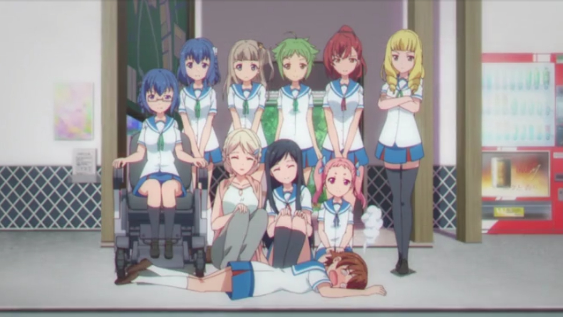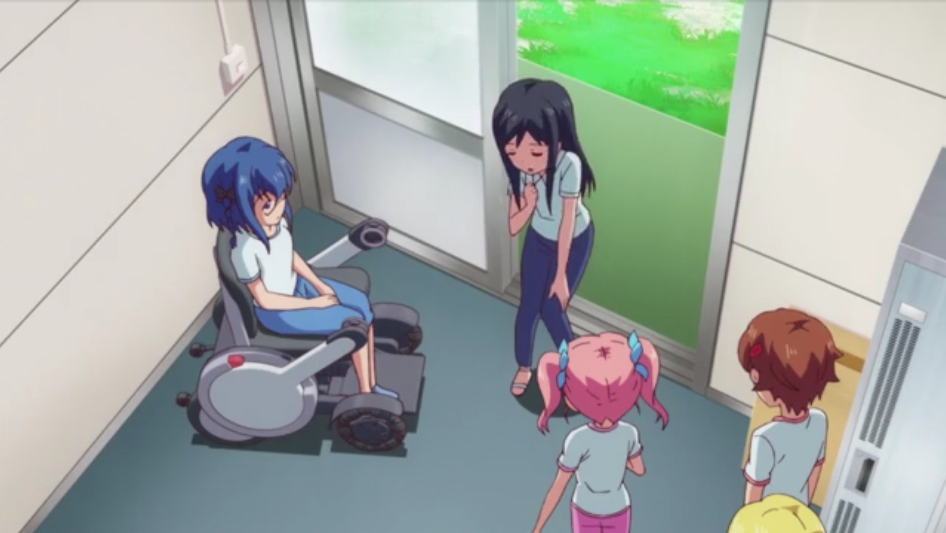 Гэнки Аяома, одна из ГГ, передвигается на инвалидной коляске или с тростью.