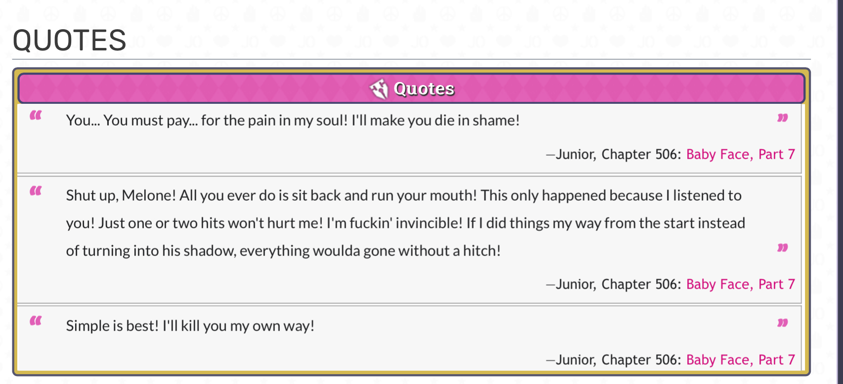 BossGeek0 / 0✓✕2512 3 декабря 202114 октября 2025Внятная речьSatoru AkefuСатору АкэфуPoco LocoПоко ЛокоEnrico PucciЭнрико ПуччиD&GДиэнджиFoo FightersФу ФайтерсDiavoloДьяволоGiorno GiovannaДжорно ДжованнаGuido MistaГвидо МистаTrish UnaТриш УнаKouichi HiroseКоичи ХиросэYuuya FungamiЮя ФунгамиAkira OtoishiАкира ОтоишиAnjuurou KatagiriАнджуро КатагириMasazo KinotoМасазо КинотоAnubisАнубисCameoКамеоMannish BoyМэнниш БойMeloneМелонеБоевой клич, повторение одной фразыJolyne KuujouДжолин КуджоGwessГвессBruno BucciaratiБруно БуччеллатиJousuke HigashikataДжоскэ ХигашикатаJoutarou KuujouДжотаро КуджоDio BrandoДио БрандоPannacotta FugoПаннакотта ФугоКомментарииMOREcy 3 декабря 2021#Poco Loco станд говорит с ним скрин .Shigachikai 4 декабря 2021#Чип трик ещёShigachikai 4 декабря 2021#вондер оф юErnestOsterman 4 декабря 2021#Камео, Мэнниш Бой, Оинго (если его можно считать) - говорить могут.dinvells 4 декабря 2021#Очередная Джо Джо коллекцияUegien 4 декабря 2021#Дзёта Кудзё - Charmy Green (cursed) - по аналогии с Star PlatinumCarl_Ernst_Kraft 4 декабря 2021#D&G - Yo-Yo MaGoriko 5 декабря 2021#sher12308 8 марта 2022#Максимально странная классификация.У многих стенды передают речь и не имеют собственного разума,логичней бы было сделать две группы : стенды,которые говорят лично,и стенды,которые передают речь владельцаschwebmu27 февраля 2023#MeloneМелоне станд baby facethesmail666 8 марта 2024#если тут есть Масазо,то я думаю можно было и Рохана добавитьApc10 июня 2025#@BossGeek, Неполный список + заброшка 👎назадТвой комментарийссылкаанимемангаранобэперсонажчеловекOKВставка изображения:OKЦитирование пользователя:OK* Текст