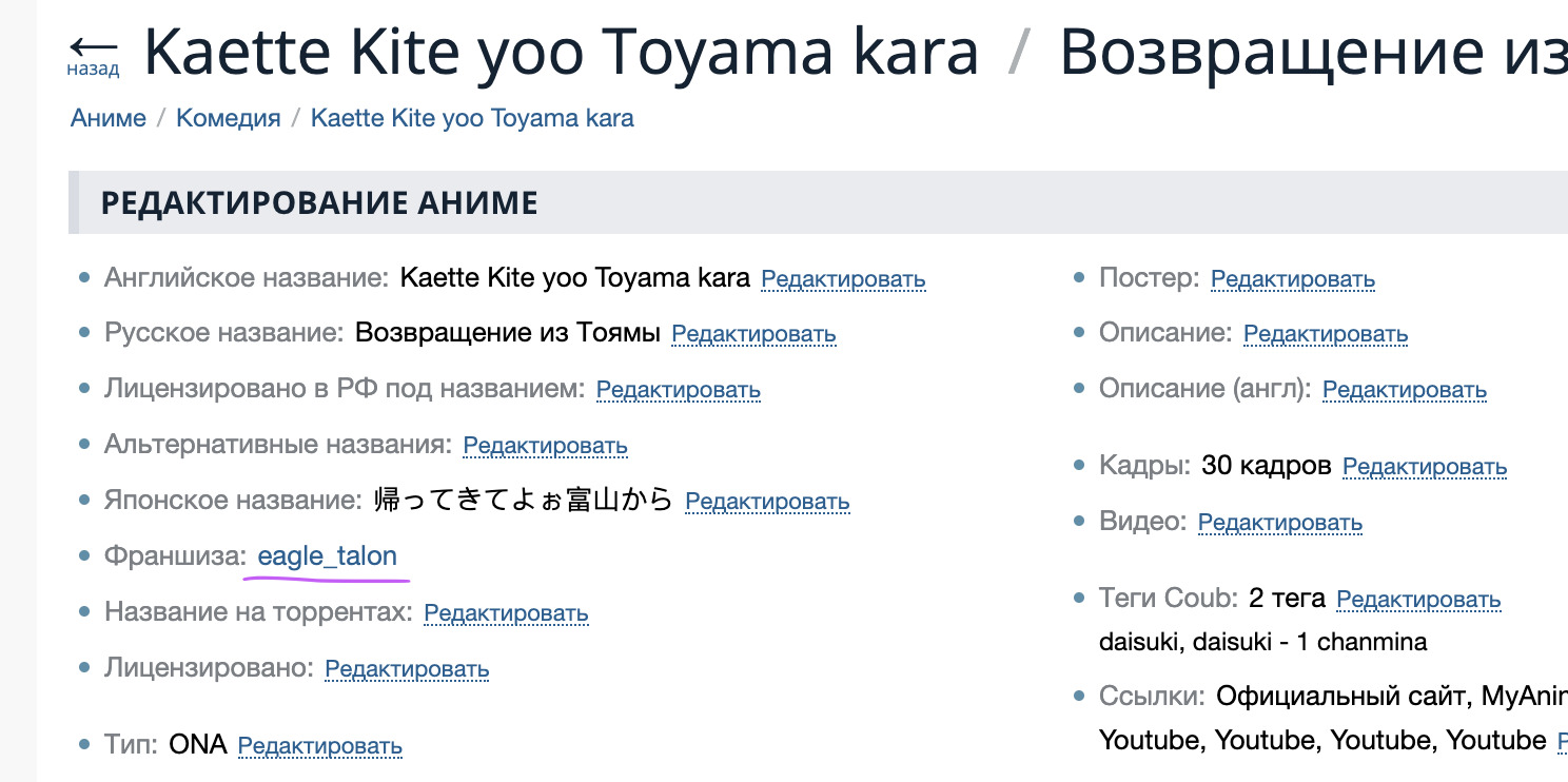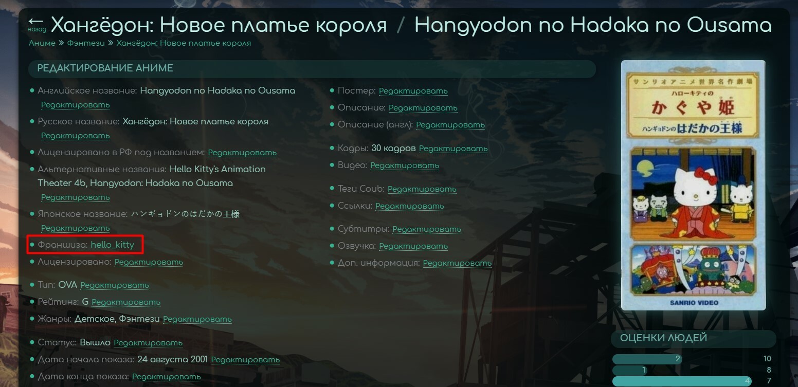 Что бы не запутаться, я не соединяю тайтлы в разброс, так что можешь продолжать склеивать остальные анимешки кроме серии Hello Kitty and Friends (заодно можешь попробовать повторно поставить отсутствующую связь). Ну а если у ты занят другим, то я вернусь к этим тайтлам, но уже после слияния Китти и Друзей с действующей франшизой.я так понимаю ты дальше сам будешь связи делать?
