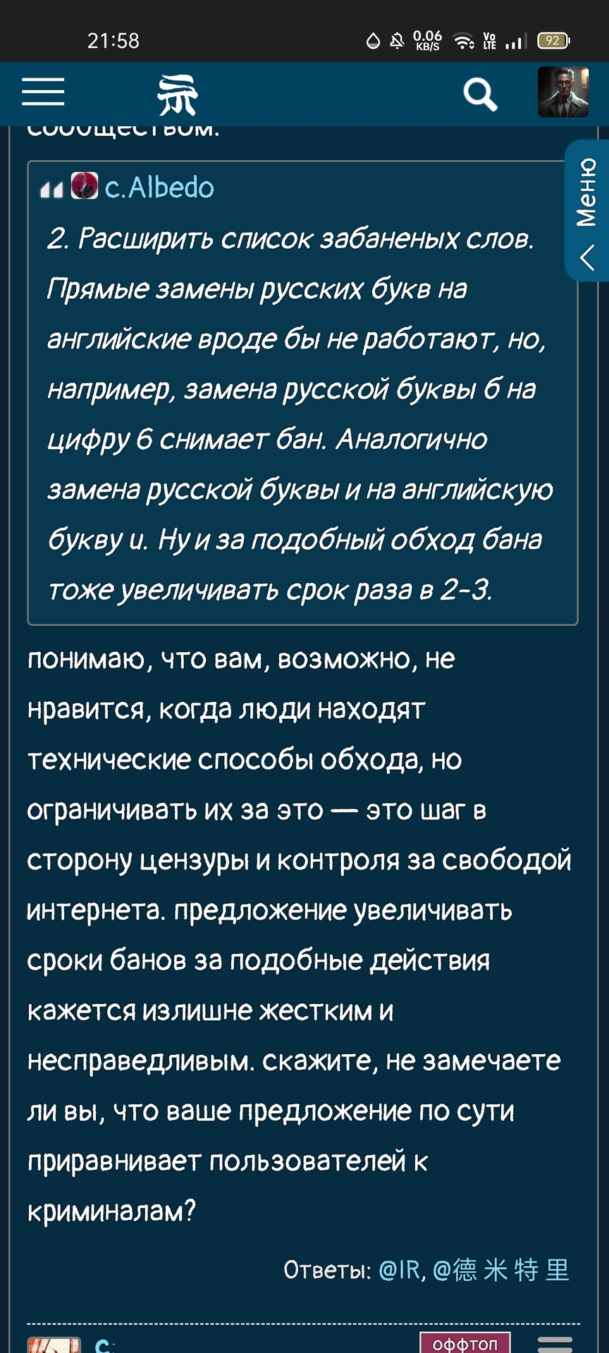 В мире где в твиттере отменяют некоторых личностей кто то на это жалуется не соблюдая правила платформы и это по твоему свобода ? И это нормальная практика когда есть блокировка /ограничения на что то полной свободы негде нету потому что это введёт анархии как я говорил выше. Попробуй что то сказать про 11 сентября тебя сразу блокнут поэтому в чем твоя проблема ? А насчёт личных сообщений в шикимори тут кроме друзей могут писать те кто спамят или отправляют всякое ,обычные нормальные пользователи общаются тут в постиках