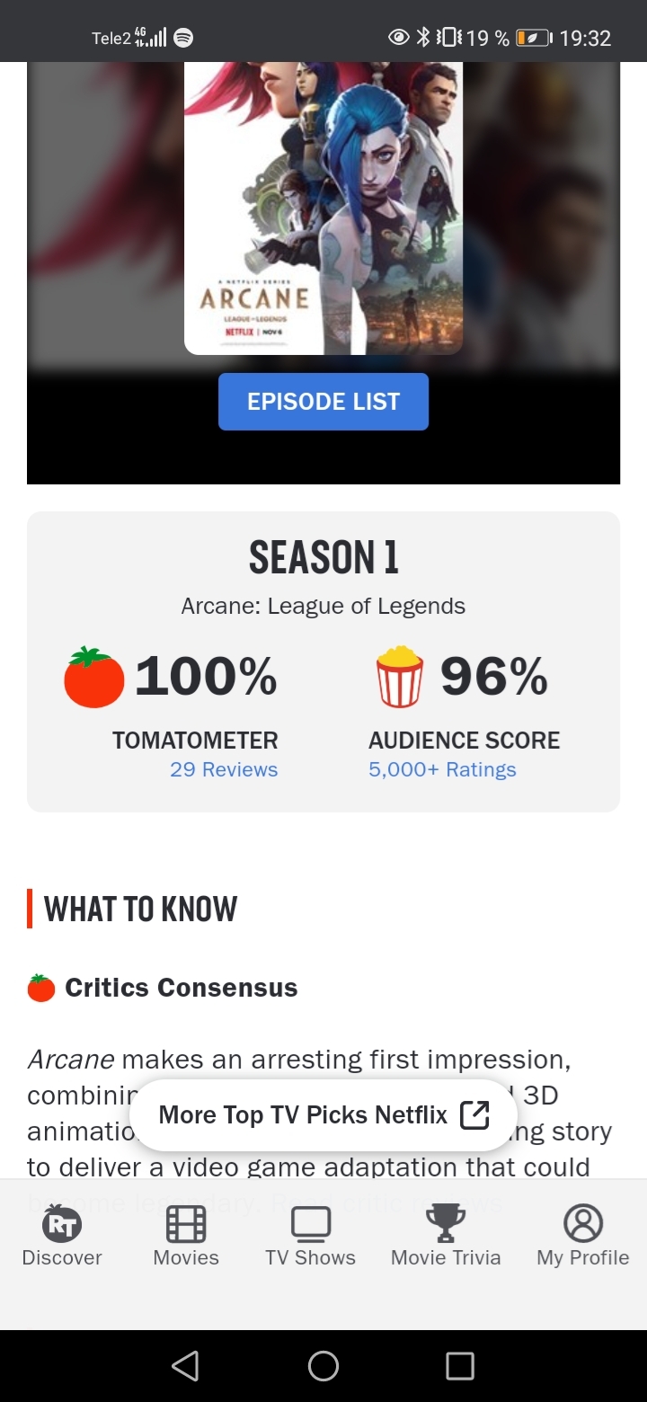 что у "Судзумэ" указано точное число рецензий кинокритиков, на основе которых цифра 96%, и число отзывов зрителей, на основе цифра 98%. У вашего любимого "Аркейна" ни слова о числе рецензий котиков и количестве отзывов зрителей. Для томатов достаточно десяток захлебывающихся от восторга рецензий и десяток таких же отзывов зрителей, и будет 100% / 100%. При первом же недовльном отзыве или недовольной рецензии тут же цифиря сваливается до 99%. Вот так все просто.