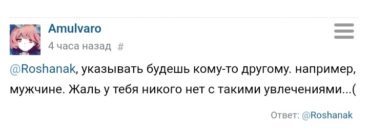 @Roshanak, ты пропустило мою мысль мимо, перечитай. Как я вообще связан с тобой...Жалко яойщиц, такие они... ну.. ты понимаешь)