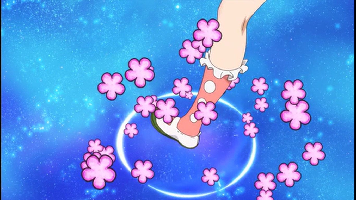 Хотя, справедливости ради, сцена из ОПа где гг ножкой наступает на ровную водную гладь, от которой после прикосновения конечности отходит круг, в которой отражается звёздноё небо, а вокруг летают розовые цветочки, выглядит красиво