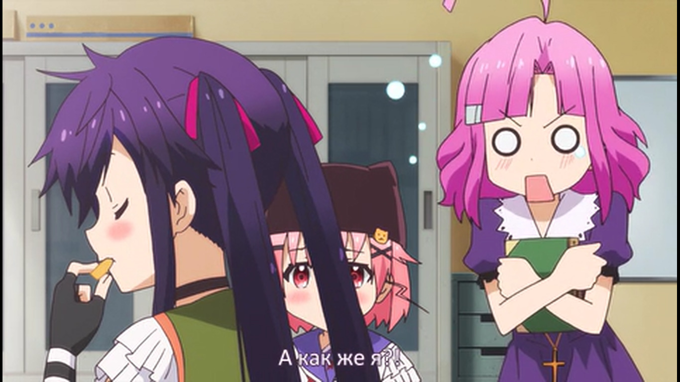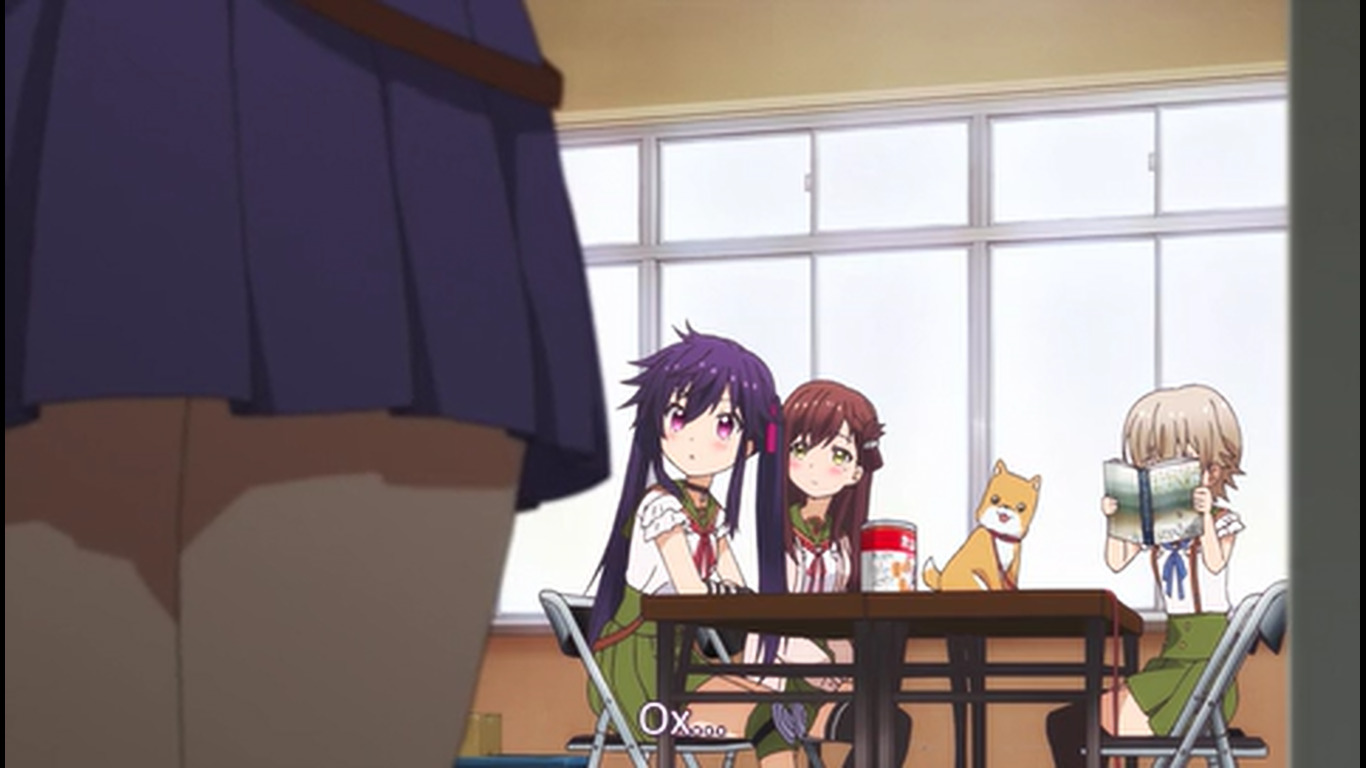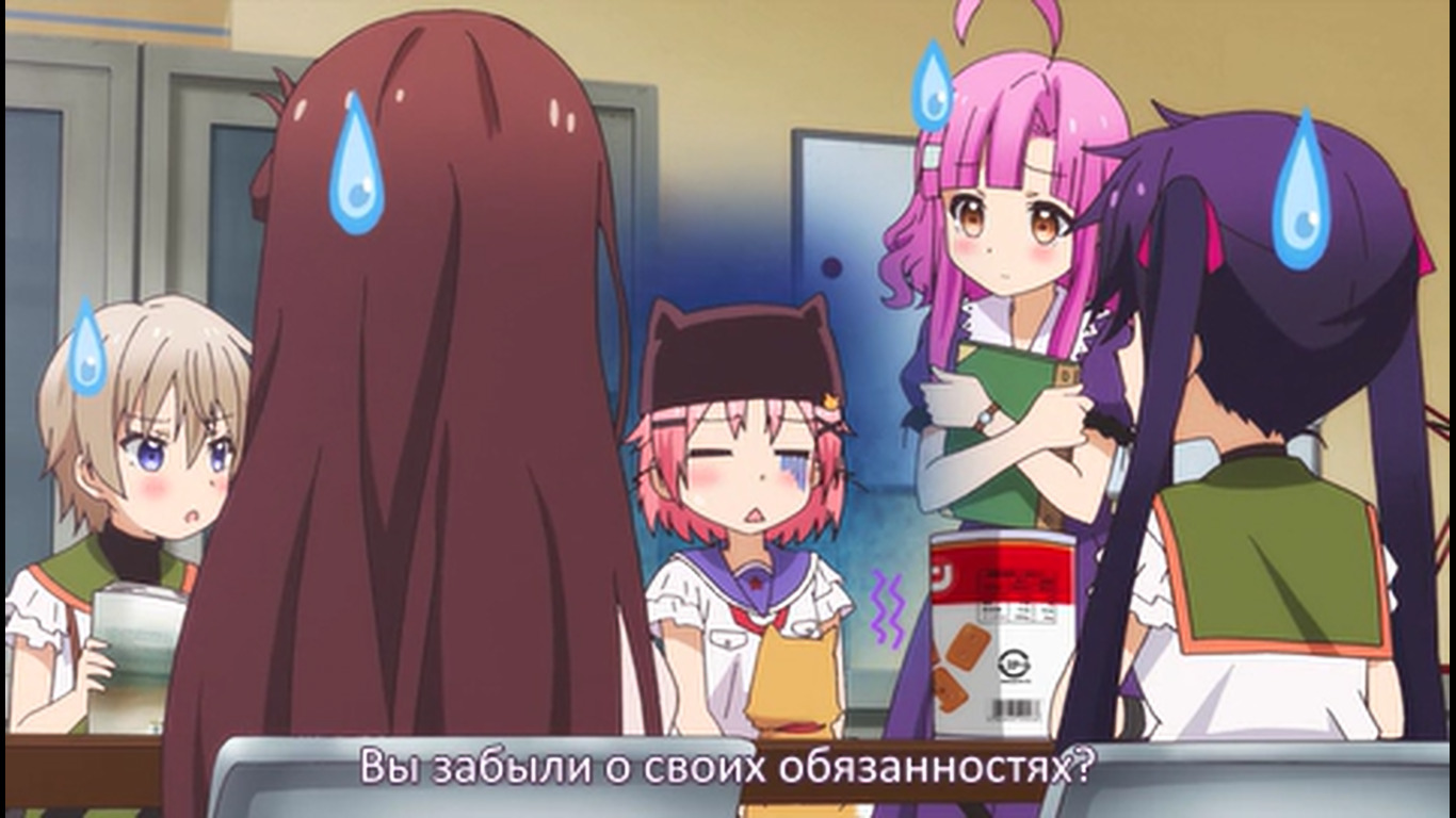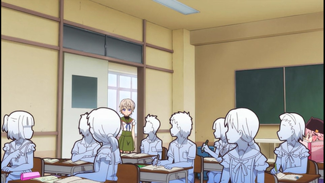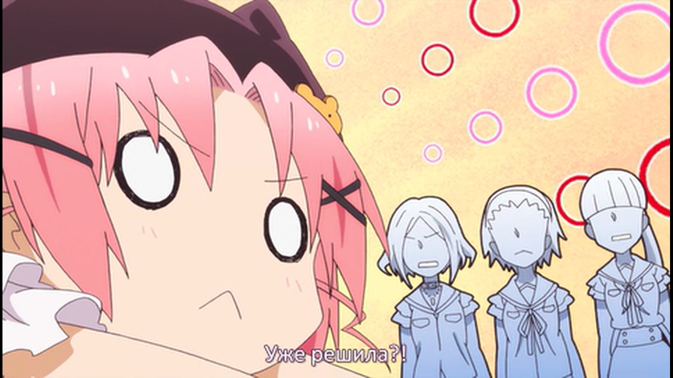 Первые 20 минут - стандартная моэ-бытовуха, со стандартными типажами, про то, как собираются на учёбу, как едят, как щебечут о всякой фигне, как гг нечаянно произносит какую-нибудь глупость, а другая моэ-баба цундерит и триггерится на это со стандартной анимацией негодования в виде дёргающегося, будто подпрыгивающего силуэта и т.д. Гг любит школу, т.к. много чего есть там и это как отдельная страна, в которой она хочет жить (и утверждает, что и другим всё это тоже нравится), но при этом раздолбайка и совсем не прилежная ученица. Беззаботная лентяйка, как она сама и описала себя. У остальных бак свистит по-своему - вместо нарочитых кривляний и ребяческого поведения - гиперчувствительная реакция на неловкие моменты, которые генерирует гг. В основном через смущение. Хотя здесь это как будто нормальное состояние девок - у них у всех щёки краснющие.