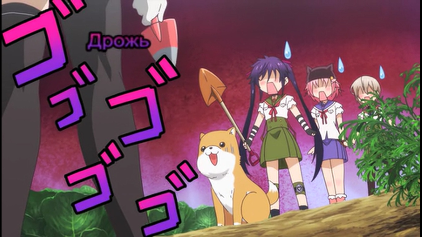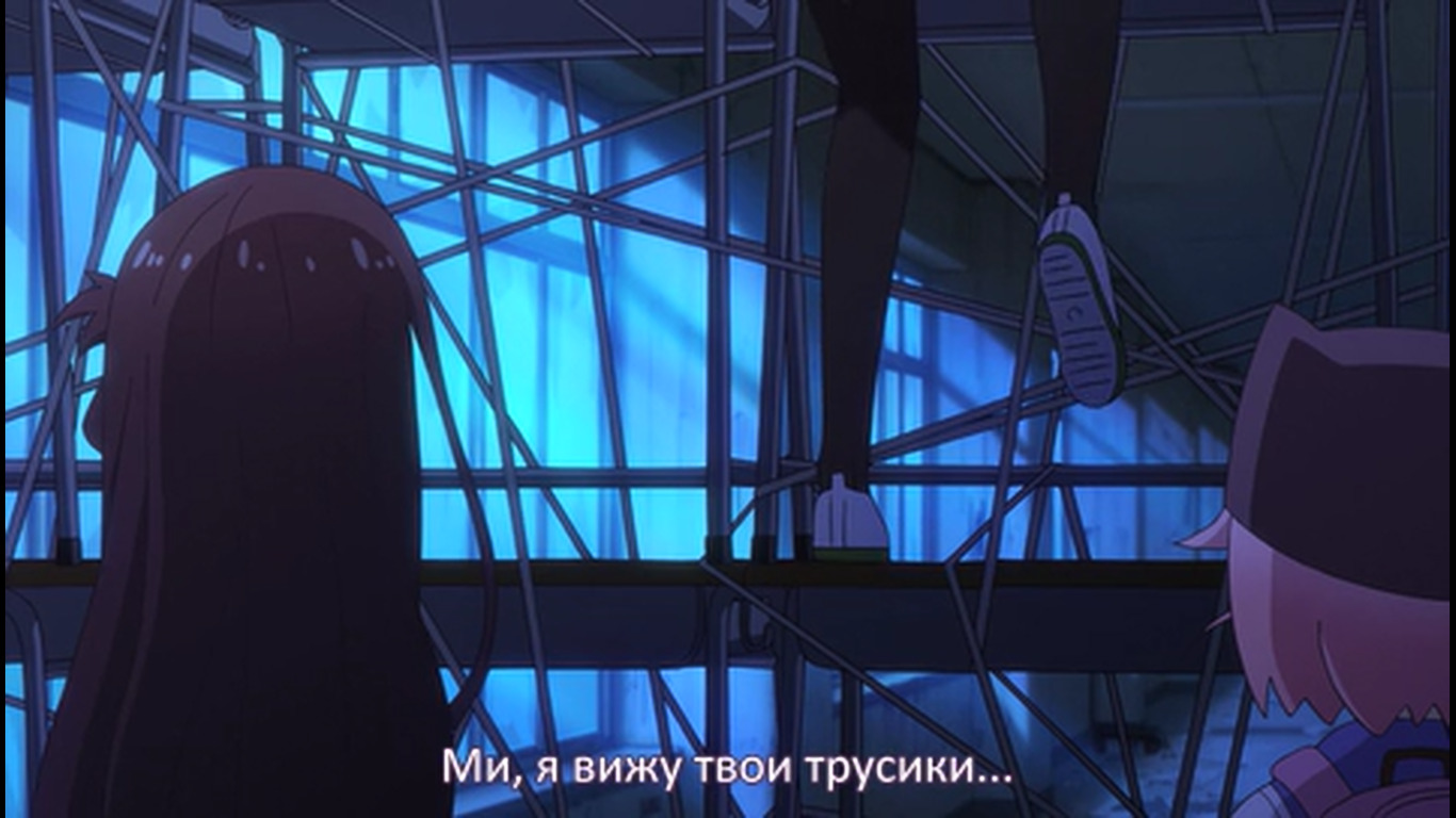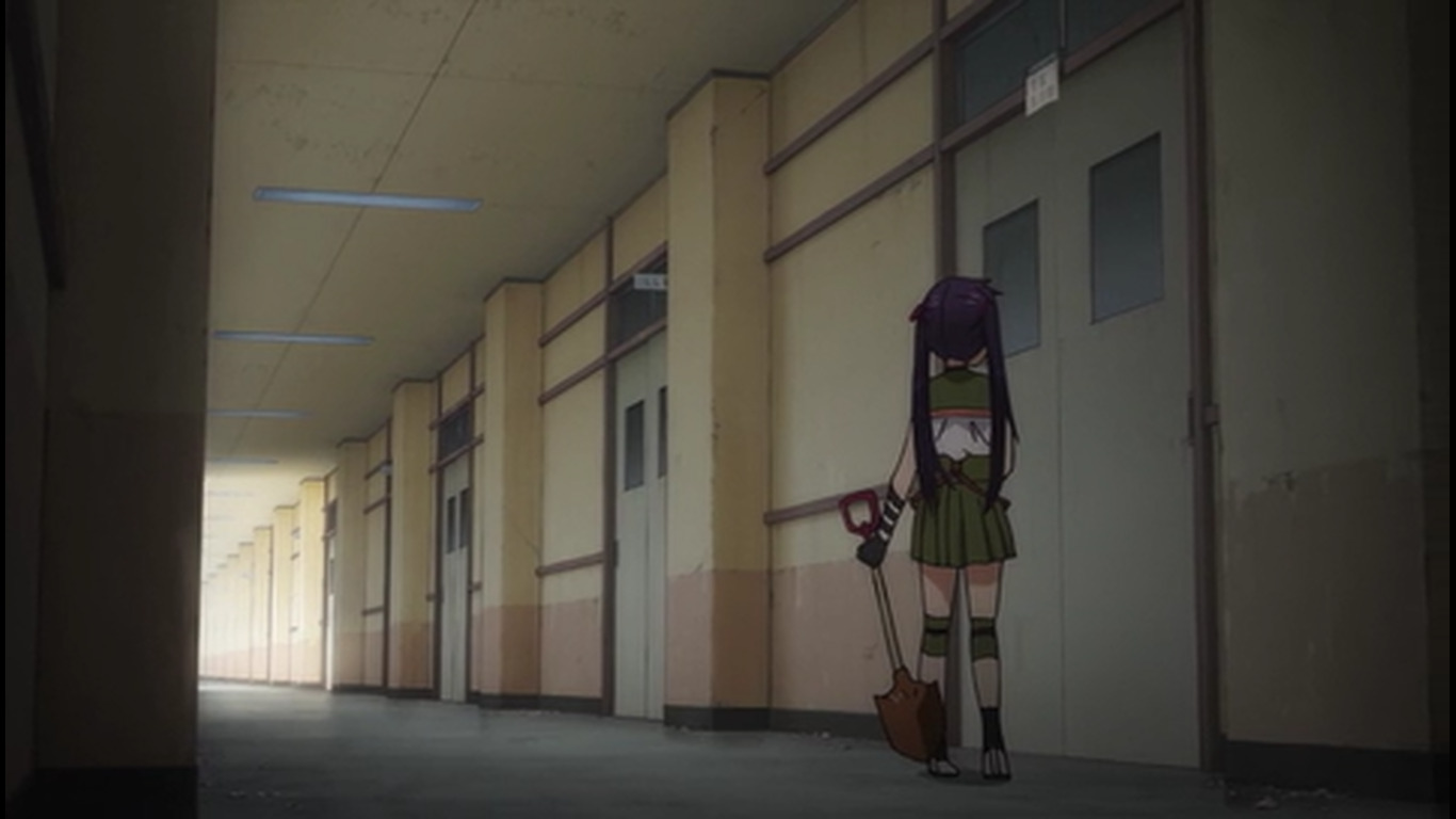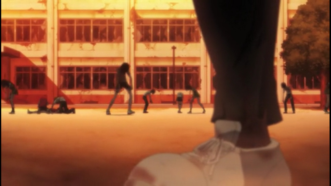 После коротенького триллер момента опять моэ тупняк. 05:42 - Они в самом деле занимаются уроками там? Одна из баб наконец сообразила, что с шизой гг надо что-то делать, а то гг чуть домой не ушла прям перед зомбарями. Другая баба упорствует, мол, разве стоит её лишать хотя бы такой счастливой жизни. "Нам можно лишь порадоваться за неё". 07:15 - Подумывают об экономии припасов т.к. галеты и электроэнергия кончаются. На крыше солнечные панели. Светленькая баба выживала одна в супермаркете. 08:02 - гг очень плохо учится - видимо, постоянный предмет для шуток такой. 08:23 - Размышляют сильно ли поразила мир эпидемия, надеются, что только их город. "Когда-нибудь нас всё равно спасут". 09:45 - Девка решила расправиться с одним блуждающим зомби лопатой, убеждала себя, что они больше не люди. Но начала колебаться, когда увидела чехол от телефона, на котором изображена влюблённая парочка. 10:03 - кинематографическая пауза во время напряжённого момента прямо перед ожидаемым действием - девочка должна была пронзить зомби лопатой. Переход на мирную сцену с гг. 10:59 - Сцена где девочка оттирает кровь от лопаты. Другие девочки говорят, что уже не первый раз она убивает зомби без необходимости вместо простого осмотра территории. "Это слишком опасно". 11:43 - Девочки предполагают, что зомби идут на звук, помнят свою прежнюю жизнь. 12:19 - Куда уж без эро фансервиса, помимо стандартной моэты: