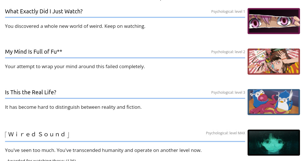 Ну здесь да, обсуждение конкретно ачивки за мангу с тегом психологии, все свои заметки по авангарду я попридержу до момента как для неё наберётся достаточно тайтлов. Запутался же я только в том о чём шла речь здесь: