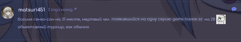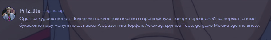 @grimik, я ничего не предлагаю. крест поставится сам и без нашего с тобой участия. это просто реальность это комменты к турниру по Лучшему персу 2019 года вот... выиграли любимки второстепенные и тут же вопрос А где Торфин? а вот нефига мне тут расхайпленные аниме везде пихать... пусть хоть раз выиграют персы второго плана... да?