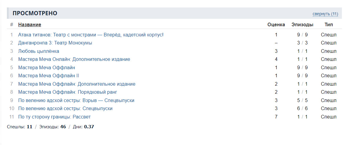 @arcticdlegion✝️💞, А ещё на тайтлах вроде Ван Писа и некоторых других популярных вещей. ФТ многим заходит, просто надо смотреть. А ещё лучше читать. Вы называете хламом то, чего не видели. И это касается почти всех аниме из ваших списков. И что касается спешлов. У вас в списке Просмотренного их почти нет. И на этом скрине все оценённые вами спешлы. Остальные единицы уже не на спешлах.