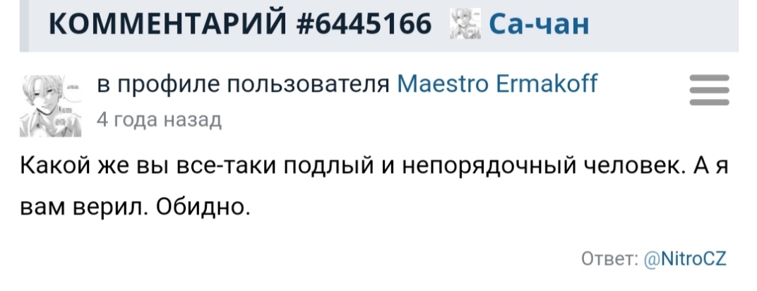 Добрый день. Я Маэстро. Маэстро Ермаков. Самый влиятельный пользователь шикимори после морра (кто меня не знает — ньюген). А, возможно, и не после. Не буду скромничать) В ЛС мне написал один из модераторов (я настолько влиятелен, что модераторы пишут мне сами), сообщил новость, что с неким Ринусом произошло краткосрочное чудо, поэтому пришёл сюда, дабы ознакомиться с ситуацией. В связи с этим событием, поступила инсайд-инфа, что коалиция модераторов в своём специальном тг-чате собирается устроить опрос, где будет поставлен вопрос о рассмотрении меня на роль модератора форума. Знаете, что? Я попросил не делать этого, ибо мой дорогой друг с шикимори, @S John, поведал, что скоро шикимори будет забанен на территории РФ, признан экстремистским сообществом и всем модерам по уголовке за участие! А я законопослушный гражданин всё-таки.