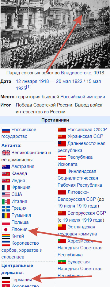 И ведь ты же открыл Википедию. Ты сам дал ссылку на статью про Интервенцию, сам! В этой статье, есть заглавная фотография, с японским, блин, флагом, прямо на самом верху, там есть список участников этой интервенции, в котором указаны и Германия, и Япония: