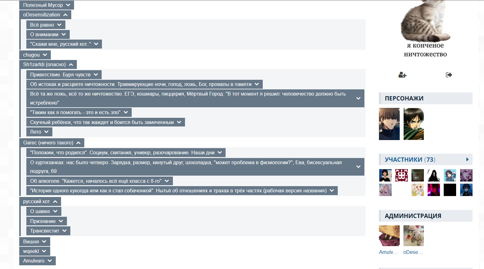 Легендарная, в узких кругах, личность. Один из самых нестабильных котов, которых я когда-либо встречал. Пару лет назад создал клуб "Конченных ничтожеств", где байтил всех на задушевные рассказы и принятия себя через попущение. Вообще, раньше частенько видел его слоняющимся по просторам Шики, но сейчас, видимо, он слез с дереализации и тяжёлых котиков.