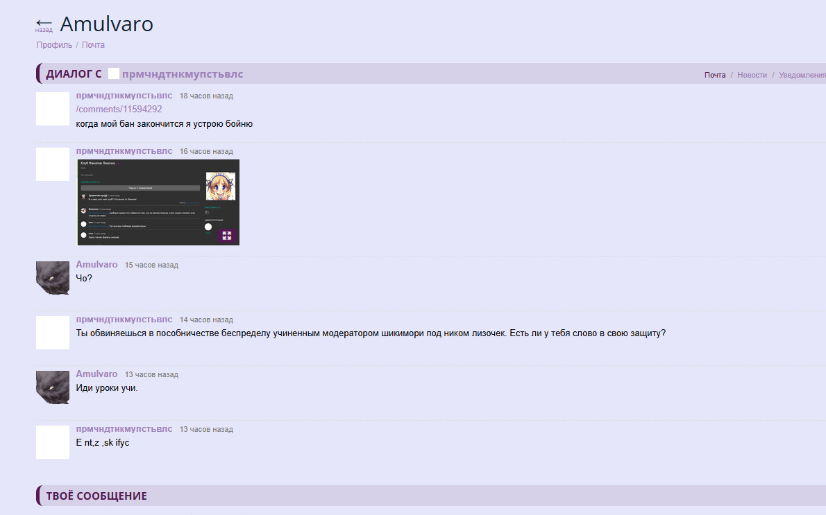 @Redyska, Кек ты узколобик не викупил зачем я забанился всего на два часа? @Redyska, Ты его сам себе делаешь. В своем манямирке До слез меня рассмешил@Remanga enjoyer, Так он сам себя не щадит) Я прям представляю его пену у рта когда меня забанило за литературное слово. Как он был рад и какое отчаяние испытает когда поймет весь цимес ситуации @Mustafa Ivanov[comment=11554793], Редиска еще танцует