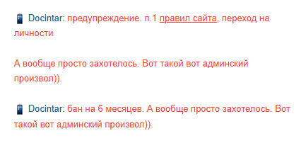 @ddn, охуеть, он чё реально двоих на полгода просто по хуйне забанили? И этот человек владелец сайта..., то есть тот кто должен на сайте вести себя как взрослый, адекватный, деловой и серьезный руководитель, а не "эмоциональный инфантильный ребенок" с правами админа... Пиздец.
