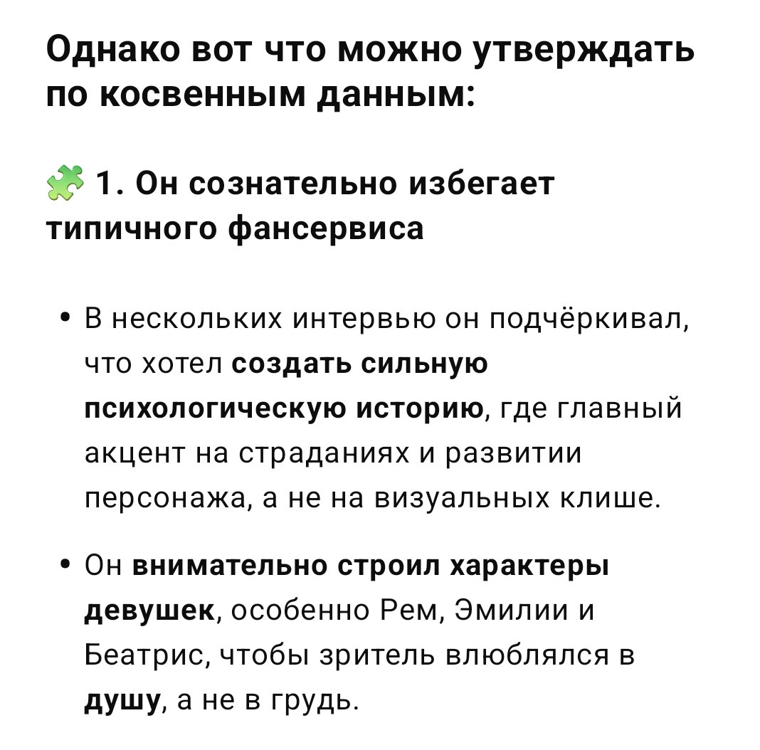Грудь эльзы, Присциллы, во-первых не направлены на камеру, во-вторых, первое имеет чёткий образ убийцы с обворожительным образом, второе же, сюжетообразующая деталь где камера не нацелена на грудь прям на грудь. В общем, классический фансервис - акцентирует внимание на возбуждении, а в резеро, не делается акцент на возбуждение, потому что некоторые персонажи - полуёбнутые, и эта штука контрит фансервисность.