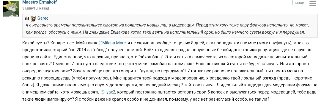 Но я с недавнего времени положительнее смотрю на появление новых лиц в модерации. Перед этим хочу тоже пару фокусов исполнить, но может, как всегда, обосрусь с ними. На днях даже Ермакова хотел таки взять на исполнительный срок, но было немного суеты вокруг и я передумал.