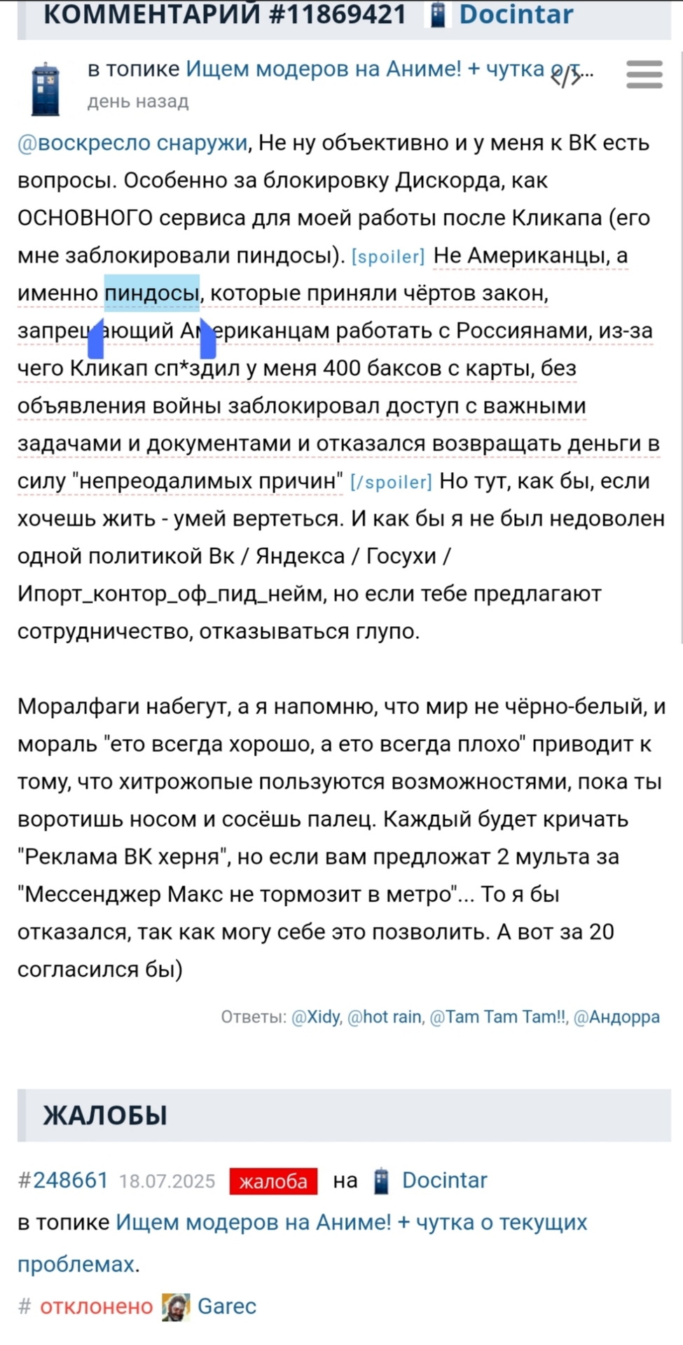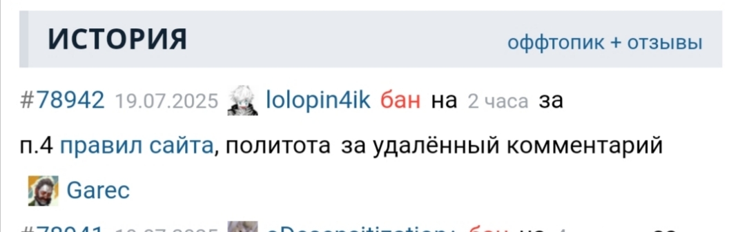 @воскресло снаружи, Гарек лолопина забанил, который повторил комментарий Дока, но там было про "хохлов" (не украинцев, он уточнил), что из-за них спотифай блокнули в РФ. Пусть восстановит комментарий, сравним. /moderations/bans/78942