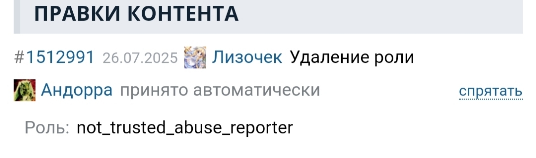 /moderations/versions/1512991 Уверен. Чёт все пренебрегают твоими "распоряжениями", супермодератор. То предупреждение Доку выдадут, хотя ты отклонял 2 раза, то роль снимут. Ехидничай дальше, сколь угодно.