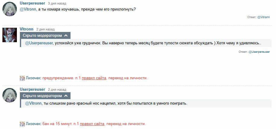 @faerd, для меня превратился, если за слова "ты слишком рано красный нос нацепил, хотя бы попытался в умного поиграть" меня банят за переход на личности. Вот такого рода переписка была, кстати:@faerd
