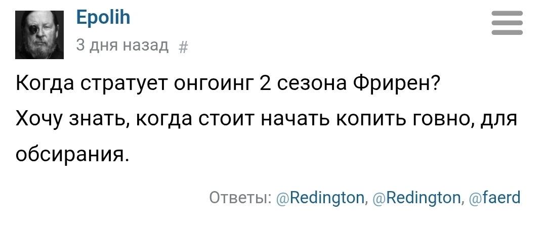 @Epolih, @amechan, А ведь были времена, когда у хейтеров Фрирен даже нормальные аргументы были, почему им тайтл не понравился. А сейчас остались только бездарные шутки про говно и оскорбления без всякой аргументации.