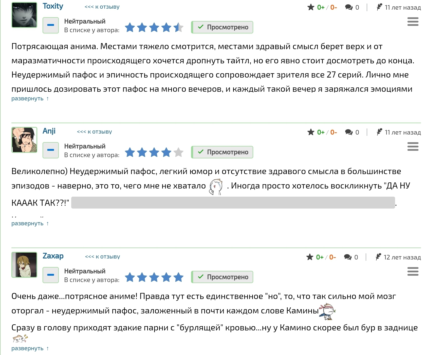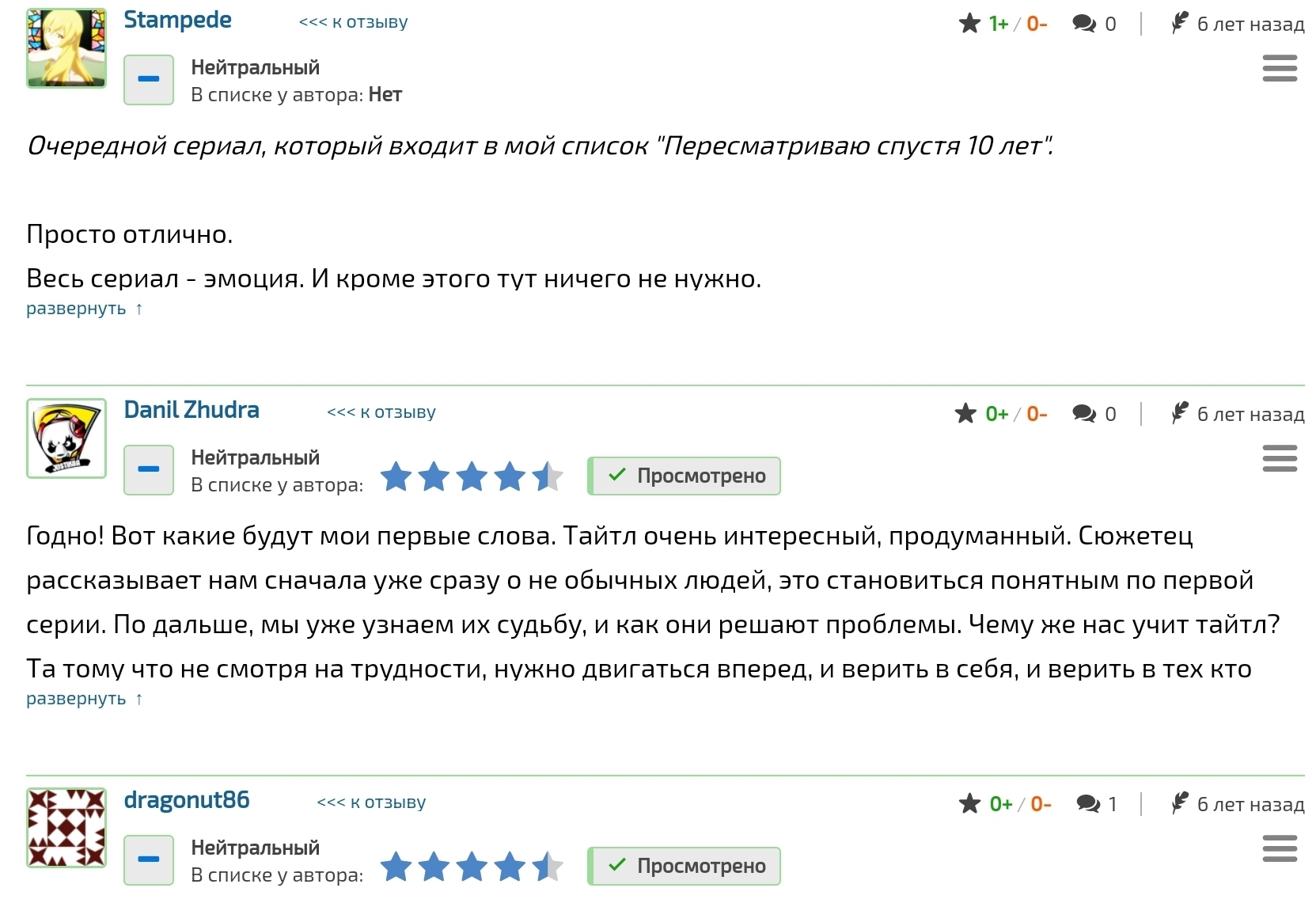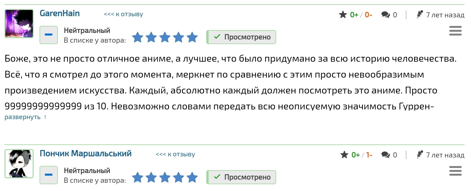 @Evgeny Gureev, Из-за того, что разделение отзывов на положительные, нейтральные и отрицательные было введено не сразу, а где-то примерно 5 лет назад, а Гуррен произведение старенькое, то раскидыванием старых отзывов по этим категориям занимался сам сайт по каким-то невиданным себе критериям и он частенько ошибался, поэтому среди нейтральных отзывов дохрена на самом деле положительных.