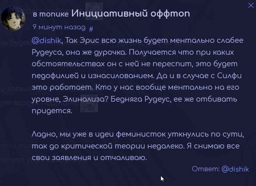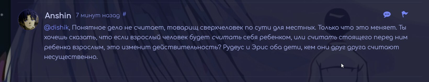 @Fantom°, Тейк про то что редеуса нельзя сравнивать/приравнивать к персонажам история.Я тут имел ввиду что гг не считает эрис равной себе поскольку она ребенок, и редеус это конкретно пояснил .